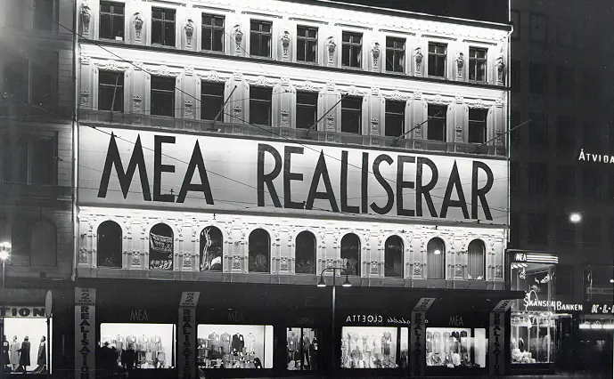 MEA, Militärekiperingsbolaget skyltar för realisation. Bild ur MEA:s arkiv hos Centrum för Näringslivshistoria.